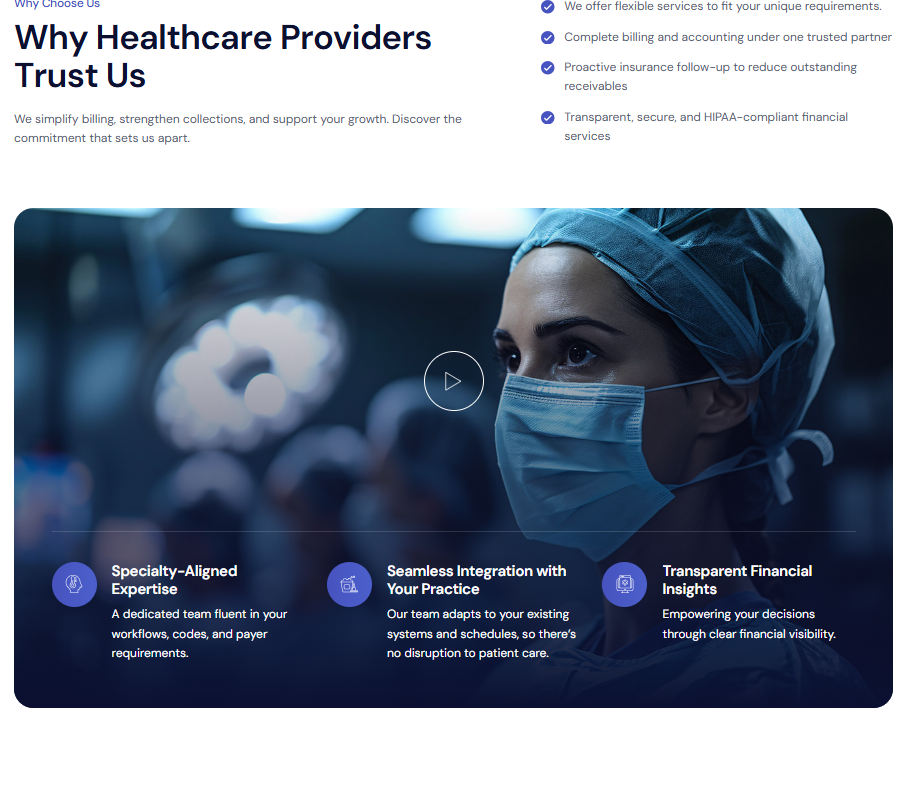 Clear, concise service pages were built to explain each offering—billing, coding, RCM, and more—while encouraging inquiries.Lead Generation Optimization