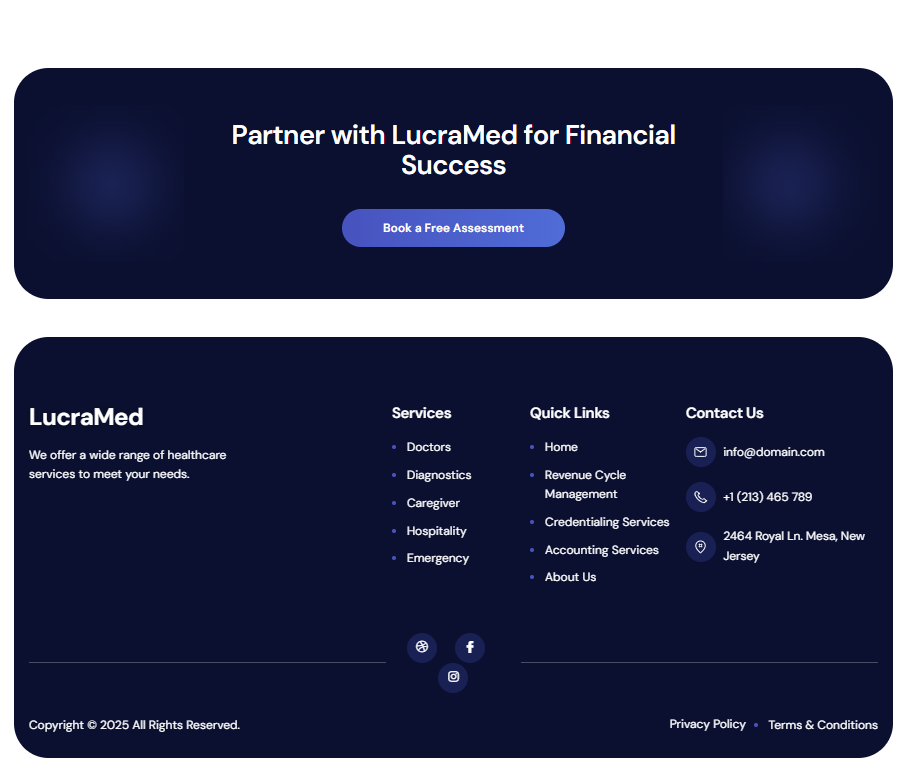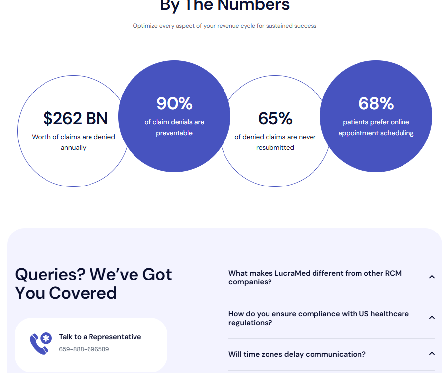 Lucramed is a healthcare company specializing in Revenue Cycle Management (RCM), offering solutions like medical billing, credentialing, and insurance verification for healthcare providers. The client needed a clean, modern, and trustworthy online presence to communicate their services and drive business inquiries.